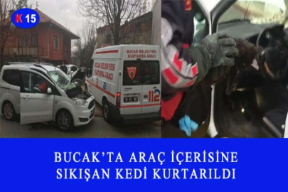 BUCAK’TA ARAÇ İÇERİSİNE SIKIŞAN KEDİ KURTARILDI