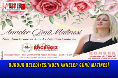 8 Mayıs Anneler Günü nedeniyle Burdur Belediyesi Anneler Günü Matinesi düzenlenecek. Matineyle ilgili açıklama yapan Burdur Belediye Başkanı Ali Orkun Ercengiz “Hayatın her alanında ve tüm dünyada sevgiyi, hoşgörüyü, fedakarlığı ve duyarlılığı temsil eden kadınlarımız toplumunun temel taşlarıdır. Yaşamımızın her alanında varlıkları ile onurlandığımız, eğiten, yetiştiren, bizi biz yapma yolunda yüreklerindeki sevgi ve şefkati veren fedakar kadınlarımızın bu vesile ile tüm Annelerimizin Günü’nü kutluyorum. 8 Mayıs Pazar günü Cumhuriyet Yaşam Merkezinde 13.30’da başlayacak olan Nurcan Altınok’un sahne alacağı eğlence programına tüm kadınlarımızı bekliyoruz. Katılım sağlamak isteyen kadınlarımız için her mahalleden ücretsiz otobüs kalkacaktır” dedi.