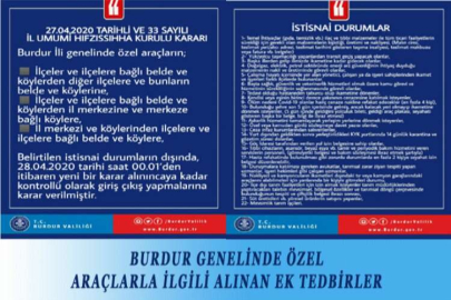 Burdur Valiliği’nden yazılı açıklama yapılarak Burdur genelinde araç yoğunluğu sebebi ile il genelinde bazı ilave tedbirler alındığı bildirilmiştir. Valilikten yapılan açıklama şöyle; “Covid-19 salgınıyla mücadele kapsamında Bilim Kurulu ve Sağlık Bakanlığının tavsiyeleri doğrultusunda Devlet tarafından alınan tedbirler, Burdur’da Valilik koordinasyonunda hassas şekilde uygulanmaya devam ediyor. Uygulanan tedbirlere ek olarak, son günlerde Burdur genelinde araç yoğunluğu ve hareketliliğinin artış göstermesi ve alınan bütün önlemlerin daha etkili olarak sonuçlarının elde edilebilmesi amacıyla, İl Pandemi Koordinasyon Kurulunun 27.04.2020 tarihli ve 5 sayılı tavsiye kararı dikkate alınarak, Burdur genelinde bazı ilave tedbirler alınmasına ihtiyaç duyulmuştur. Bu kapsamda Burdur Valisi Hasan Şıldak başkanlığında toplanan İl Umumi Hıfzıssıhha Kurulunun 27.04.2020 tarihli toplantısında alınan 33 sayılı karar doğrultusunda, 28.04.2020 tarihinden itibaren özel araçların kararda belirtilen istisnalar dışında Burdur İli genelinde İl Merkezi ve İlçelere kontrollü olarak giriş çıkış yapmalarına karar verilmiştir. 27.04.2020 Tarihli Karara göre Burdur genelinde özel araçların; İlçeler ve ilçelere bağlı belde ve köylerden diğer ilçelere ve bunların belde ve köylerine, İlçeler ve ilçelere bağlı belde ve köylerden il merkezine ve merkeze bağlı köylere, İl merkezi ve köylerinden ilçelere ve ilçelere bağlı belde ve köylere, Belirtilen istisnai durumların dışında, 28.04.2020 tarihinden itibaren yeni bir karar alınıncaya kadar kontrollü olarak giriş çıkış yapmalarına karar verilmiştir. Alınan karardaki istisnai durumlar şöyle; 1- Temel İhtiyaçlar, ilaç ve tıbbi malzemeler ile tüm ticari faaliyetlerin sürekliği için gerekli olan malzemelerin lojistiği, üretimi ve nakliyesi, 2- Yük/yolcu taşımacılığı yapanlardan transit geçiş yapacak olanlar,3- Başka illerden gelip Burdur ikametine kadar gidecek olanlar, 4- Doğalgaz, elektrik, petrol sektöründe enerji arz güvenliğinin ihtiyaç duyduğu malzemenin nakli ve üretiminde görevli olanlar, 5- Çalışma hayatı içerisinde yer alan yönetici, çalışan ya da işyeri sahiplerinden ikamet ve işyerleri farklı ilçelerde bulunanlar, 6- Başta sağlık, güvenlik ve veterinerlik hizmetleri olmak üzere kamu görevi ve hizmetinin sürekliliğinin sağlanmasında görevli olanlar, 7- Tedavi olduğu hastaneden taburcu olup ikametine dönenler, 8- Kendisi veya eşinin birinci derece yakınının cenazesine katılmak isteyenler,