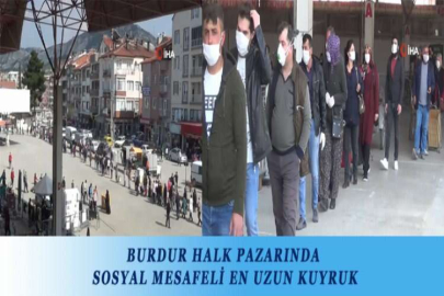 Burdur merkezde her hafta Salı günü kurulan, bölgenin en büyük halk pazarından alışverişe gelen vatandaşlar pazara girebilmek için uzun kuyruklar oluşturdu. Şehir Merkezi Uzay Çatı altında salı günleri kurulan halk pazarının etrafı Korona virüs tedbirleri kapsamında İl Emniyet Müdürlüğü ekipleri tarafından bariyerle çevrildi. Pazara alışveriş için gelenler vatandaşlar pazara giriş için tek kapıya yönlendirilip sosyal mesafeye uymaları yönünde görevlilerce sık sık uyarılarda bulunuldu. Girişte ateşleri ölçülen vatandaşlar, belediyenin kurduğu dezenfeksiyon tünelinden geçtikten sonra içeri tek tek alındı. Pazarda görevli ekipler, vatandaşlara sosyal mesafeye uymaları konusunda sürekli uyarıda bulundu. Alış verişini tamamlayan vatandaşlar pazarın diğer çıkış kapısından çıkabildi. Pazar girişinde sosyal mesafe kuralları çerçevesinde oluşan yaklaşık 300 metrelik kuyruk görenleri hayrete düşürdü.