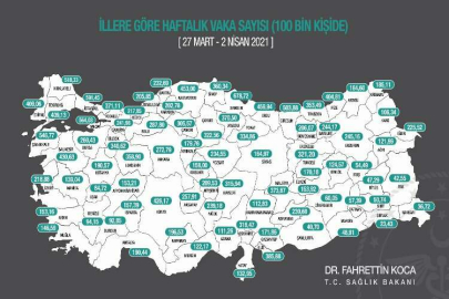 Sağlık Bakanı Fahrettin Koca tarafından Türkiye İllerin risk haritası her hafta paylaşılıyor. Bu hafta Burdur’da vaka sayısının artışa geçtiği görülüyor. Bakan Koca risk haritası paylaşımında; “İllerimizde 100.000 nüfusa karşılık gelen haftalık vaka sayısını gösteren insidans haritamızın güncel hali. Durumu lehimize çevirmek elimizde” dedi.