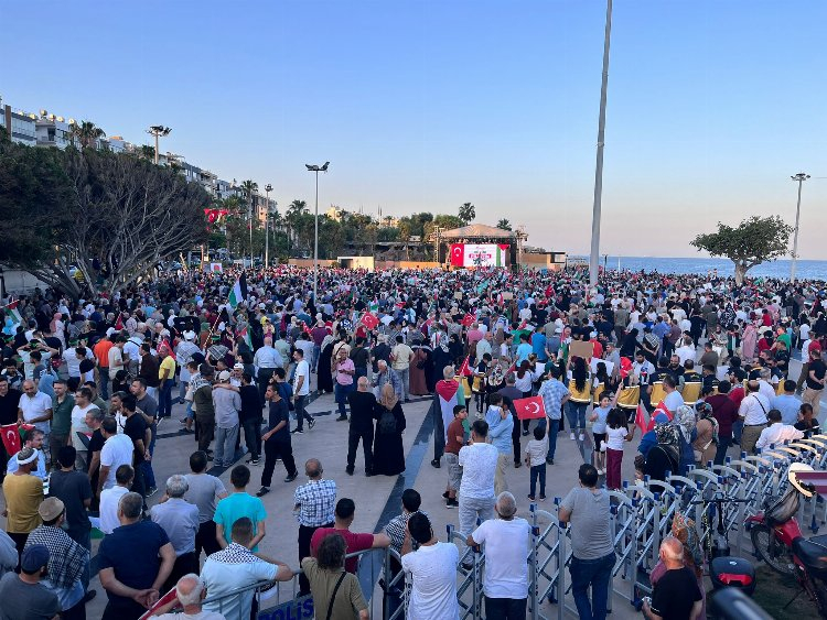 Mersin Filistin Dayanışma Platformu öncülüğünde Adnan Menderes Bulvarı'nın sahil şeridindeki Özgecan Aslan Barış Meydanı'nda organize edilen mitinge yaklaşık 6 bin kişi katıldı.