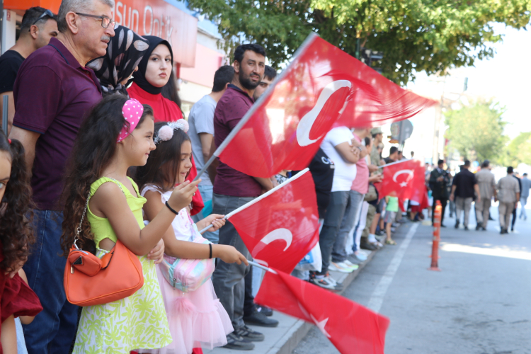 Törende, saygı duruşunda bulunulması ve İstiklal Marşı'nın okunmasının ardından Vali Aydın Baruş, Garnizon Komutanı Piyade Albay Mustafa Kahraman, Belediye Başkanı Şükrü Başdeğirmen vatandaşları selamladı.