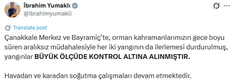 Yangınlara ilişkin bilgi veren Yumaklı, "Çanakkale merkez ve Bayramiç'te, orman kahramanlarımızın gece boyu süren aralıksız müdahalesiyle her iki yangının da ilerlemesi durdurulmuş, yangınlar büyük ölçüde kontrol altına alınmıştır. Havadan ve karadan soğutma çalışmaları devam etmektedir." ifadelerini kullandı.