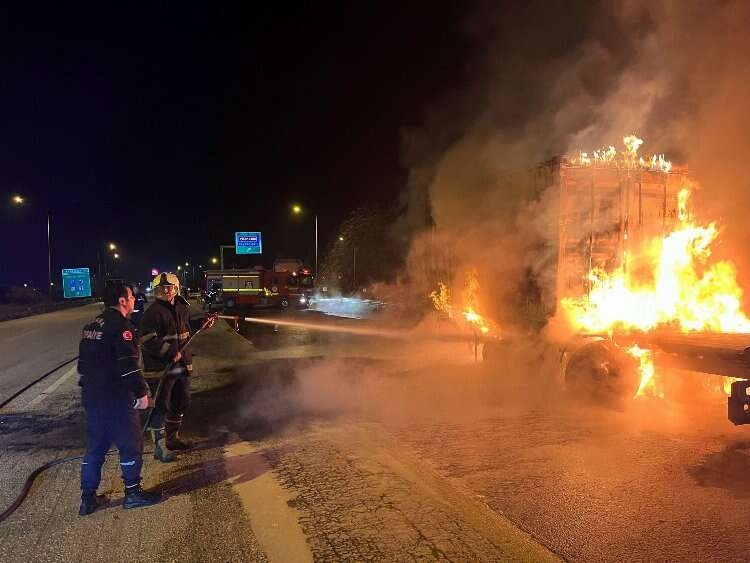 Tarsus-Adana-Gaziantep (TAG) Otoyolu Ceyhan batı gişelerinde, sürücüsünün kimliği öğrenilemeyen 33 ALS 668 plakalı tır seyir halindeyken alev aldı.