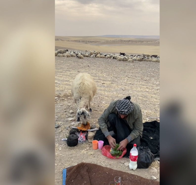 Şanlıurfalı çoban Velad Kıraç ile kek ve lahmacun yeme görüntüleriyle sosyal medyada ilgi gören "Gülçin" adlı koyunu arasındaki dostluk gülümsetiyor.