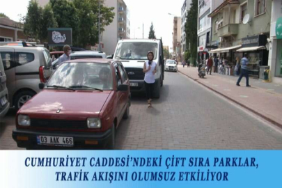 CUMHURİYET CADDESİ’NDEKİ ÇİFT SIRA PARKLAR, TRAFİK AKIŞINI OLUMSUZ ETKİLİYOR