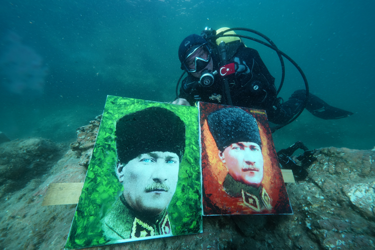 Cumhuriyet'in kuruluşunun 102. yıl dönümü dolayısıyla su altında özel ekipmanlarla Atatürk portreleri boyandı.