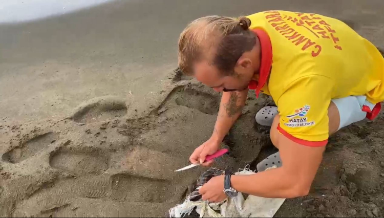 Hatay'ın Samandağ ilçesinde sahilde çuvala dolanmış halde bulunan caretta caretta yavrusu, cankurtaran ekiplerince kurtarıldı.