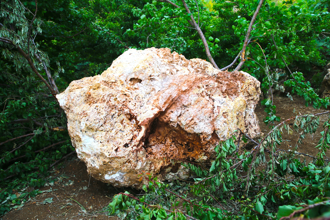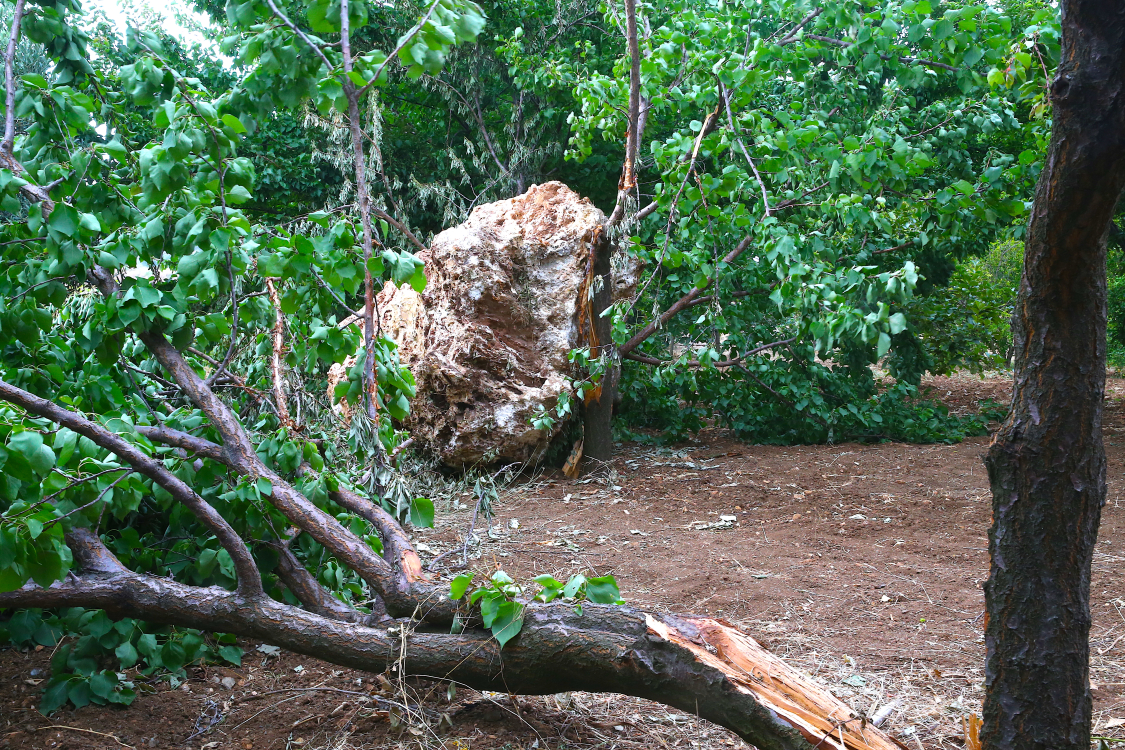 Dursunlu Mahallesi'nde, dağdan kopan kaya parçasının düştüğü Altınöz ailesine ait bahçedeki 2 ağaç zarar gördü.