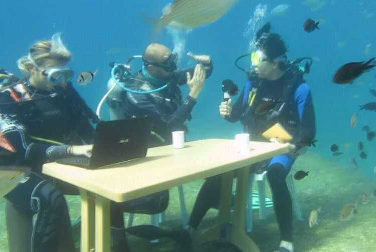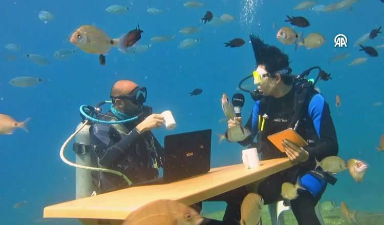 Suyun altında kurdukları masanın etrafına oturan dalgıçlar, Turizm Haftası dolayısıyla temsili olarak sezon değerlendirmesi yaptı. Dalgıçların su altındaki ilginç görüntüsü su altı kamerasıyla kaydedildi. Bir dalgıç önündeki bilgisayara not alırken dalgıcın biri de diğerinin sorduğu sorulara temsili olarak yanıt verdi.