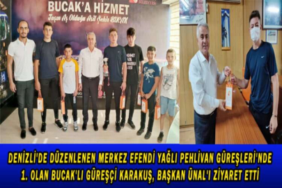 DENİZLİ'DE DÜZENLENEN MERKEZ EFENDİ YAĞLI PEHLİVAN GÜREŞLERİ'NDE 1. OLAN BUCAK'LI GÜREŞÇİ KARAKUŞ, BAŞKAN ÜNAL'I ZİYARET ETTİ