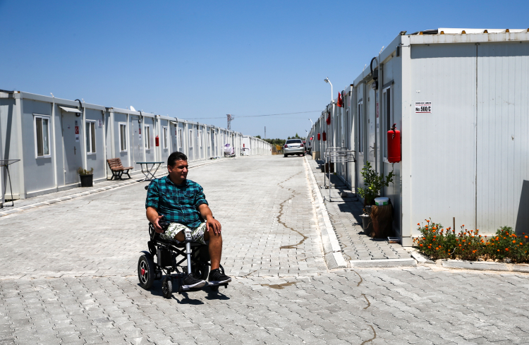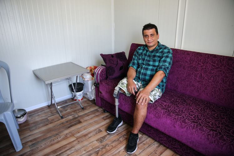 Hatay'da 6 Şubat 2023'teki ilk depremde yıkılan binanın enkazından 149 saat sonra kurtarılan Mustafa Esmergil, kesilen bacağının yerine yapılan protezle Adana'daki konteyner kentte yaşıyor.