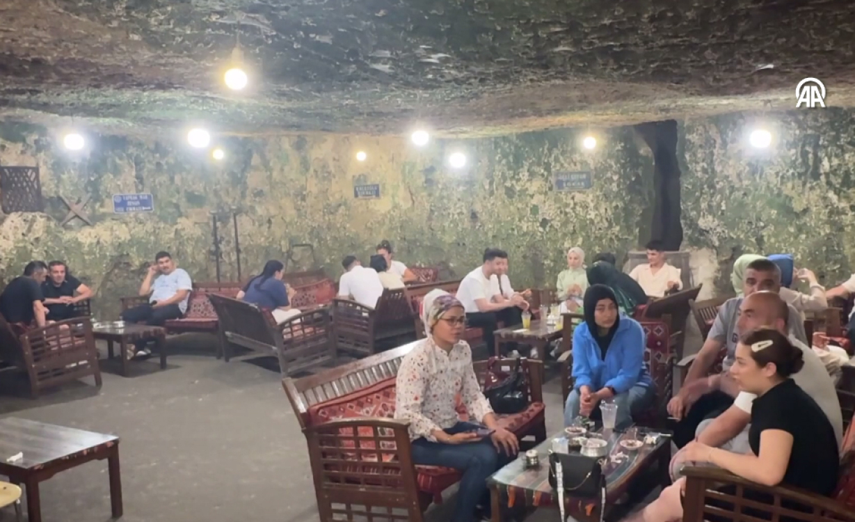 Gaziantep savunmasında yiyecek ve cephane saklanan Şekeroğlu Mahallesi'ndeki mağara kafeye gelen vatandaşlar, serinlemeye çalışıyor.