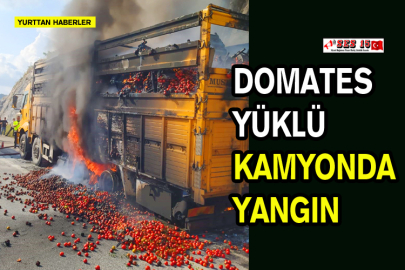 Yangın nedeniyle kamyonun kasasında hasar oluştu, domatesler yola savruldu.
