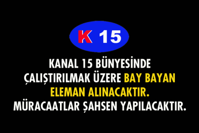Kanal 15 Bünyesinde Çalıştırılmak Üzere Bay Bayan Eleman Alınacaktır. Müracaatlar Şahsen Yapılacaktır.