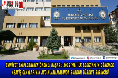EMNİYET EKİPLERİNDEN ÖNEMLİ BAŞARI: 2022 YILI İLK SEKİZ AYLIK DÖNEMDE ASAYİŞ OLAYLARININ AYDINLATILMASINDA BURDUR TÜRKİYE BİRİNCİSİ