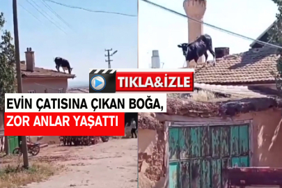 Ardından bitişindeki müstakil evin çatısına atlayan boğa, tekrar ahırın damına indi.
