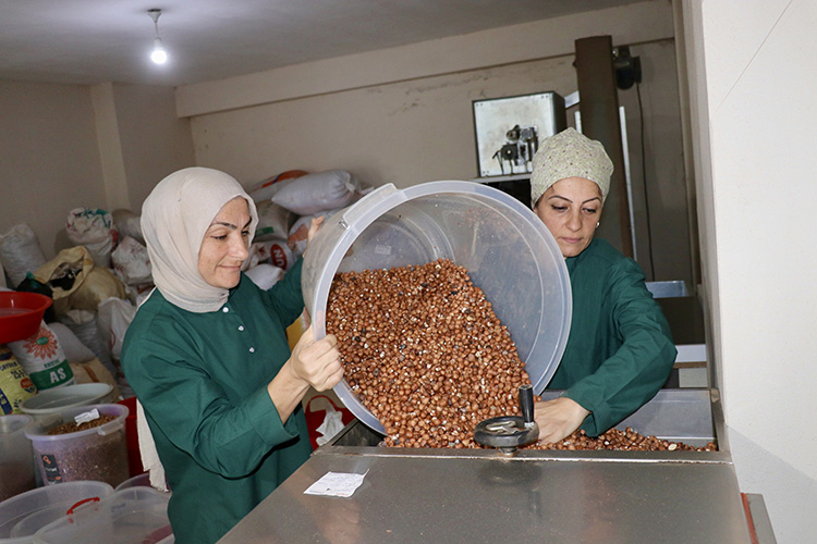 Trabzon'da fındık üreticisi Nurcan Yılmaz, iki yıl önce Küçük ve Orta Ölçekli İşletmeleri Geliştirme ve Destekleme İdaresi Başkanlığının (KOSGEB) katkısıyla kurduğu atölyede hem kendi ürettiği hem de müşterilerinin getirdiği fındığı işliyor.