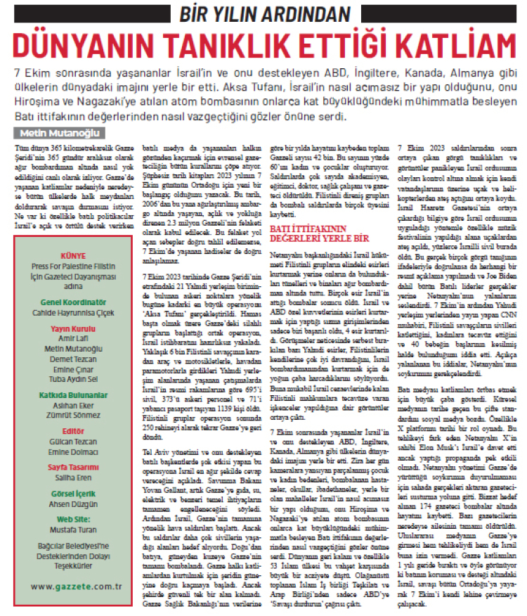 7 Ekim 2023 tarihinde İsrail'in Gazze'ye yaptığı saldırıyla yaşanan katliam ve acıların birinci yıldönümü, ülkemizde birçok gösteri ve eylemle kınandı. Eylemlerin yanı sıra basın emekçilerinin 1 yıllık süreçte Gazze'de yaşananları dünyaya duyurmasıyla birlikte yaşanan soykırımı da gözler önüne serdiler. Saldırının yıldönümünde anlamlı bir gazete çıkaran gazeteciler "GaZZete" ile soykırımı belgelendirerek İsrail'in yaşattığı acıları en iyi şekilde gözler önüne serdiler.