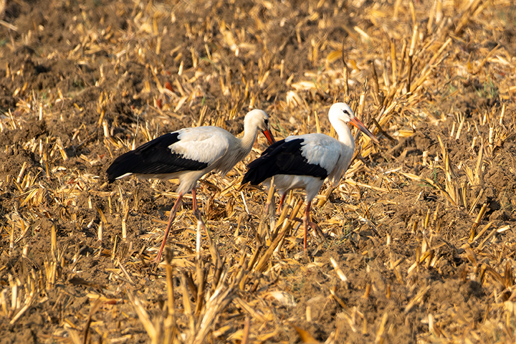 Yüreğir ilçesinde hasat edilmiş mısır tarlasına inen leylekler, burada bir süre dinlendi.