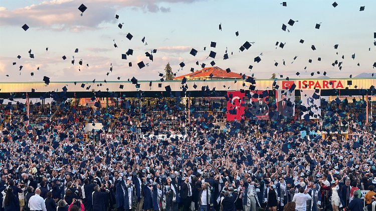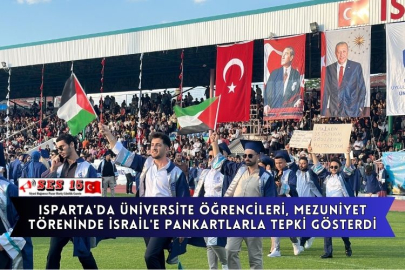 Isparta Uygulamalı Bilimler Üniversitesi (ISUBÜ) öğrencileri, mezuniyet töreninde İsrail'in Filistin'e yönelik saldırılarına pankartlarla tepki gösterdi.