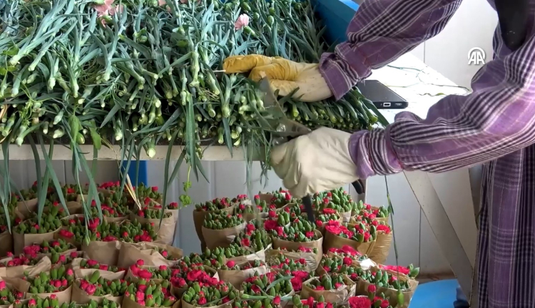 Yıllık yaklaşık 250 milyon dal karanfilin üretildiği seralarda, sabah erken saatlerde kesim işlemi yapılan çiçekler temizlenip paketleniyor.