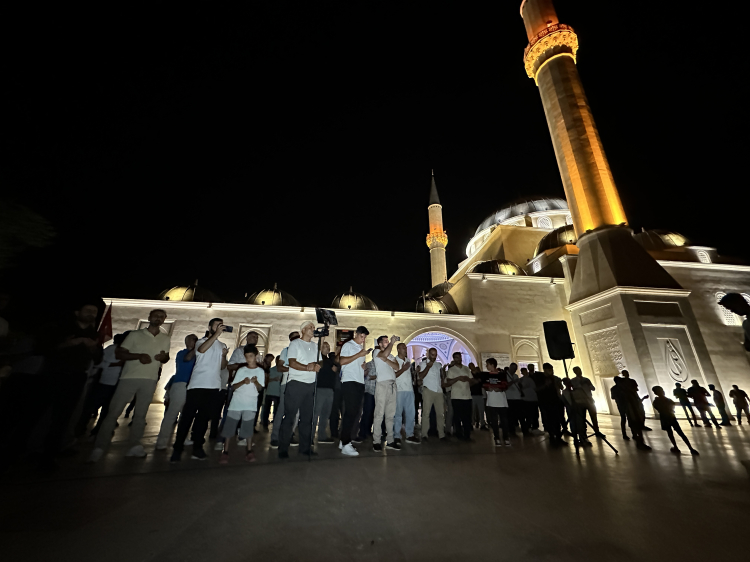 Hür Dava Partisi (HÜDA PAR) İl Başkanlığınca düzenlenen etkinlik kapsamında Çelebi Sultan Mehmet Camisi önünde toplanan vatandaşlar, Türk ve Filistin bayrakları ile dövizlerle Gazze'ye destek sloganları attı.