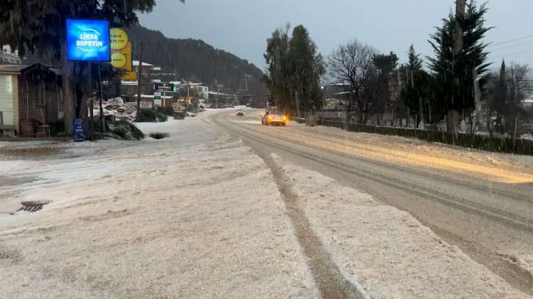Kaş-Antalya D-400 kara yolu Ağullu Mahallesi mevkisinde akşam saatlerinde başlayan şiddetli dolu nedeniyle trafikte aksamalar yaşandı.