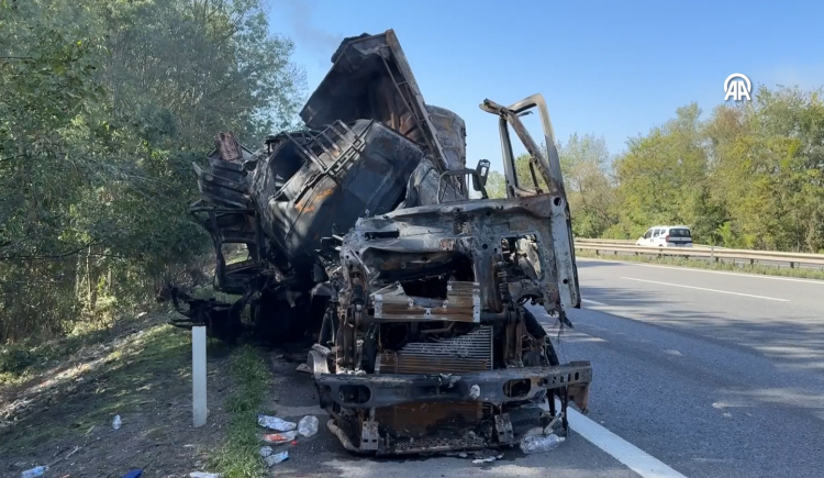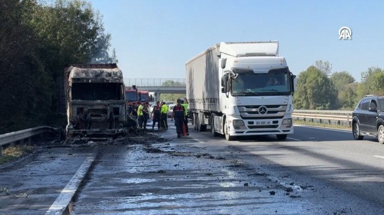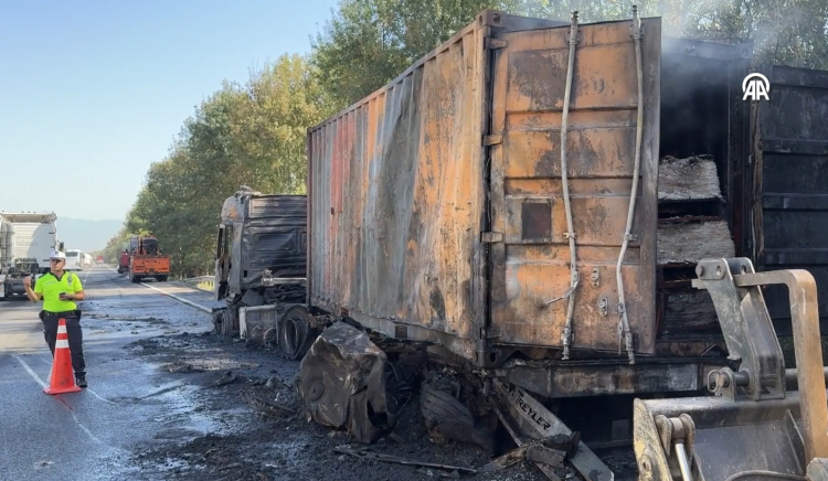 Anadolu Otoyolu'nun Sakarya kesiminde kaza sonrası yangın çıkan 2 tırın sürücüleri yaralandı.