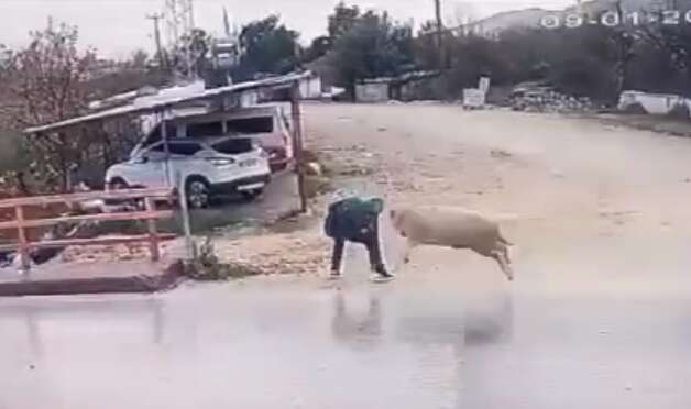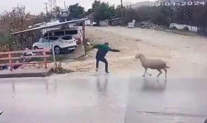 Antalya'nın Finike ilçesinde yolun karşısına geçmeye çalışan yayanın koçun boynuz darbesi sonucu düşmesi güvenlik kamerasınca kaydedildi.