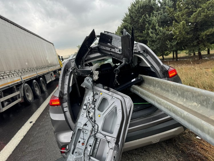 Savrulan aracın sağ tarafı, yol kenarındaki bariyere saplandı.