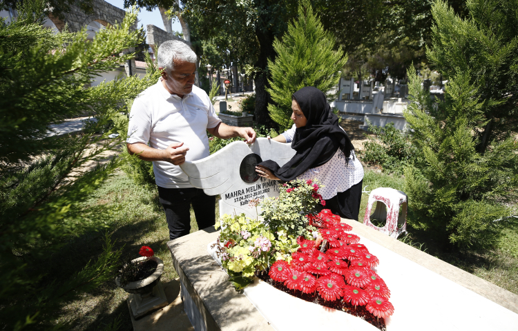 Serik ilçesi Belek Mahallesi'nde 2022'de sahipsiz köpeklerden kaçarken kamyonun altında kalarak yaralanan ve kaldırıldığı hastanede yaşamını yitiren Mahra Melin Pınar'ın annesi Derya Pınar, kızının kabrini düzenli olarak ziyaret ediyor.