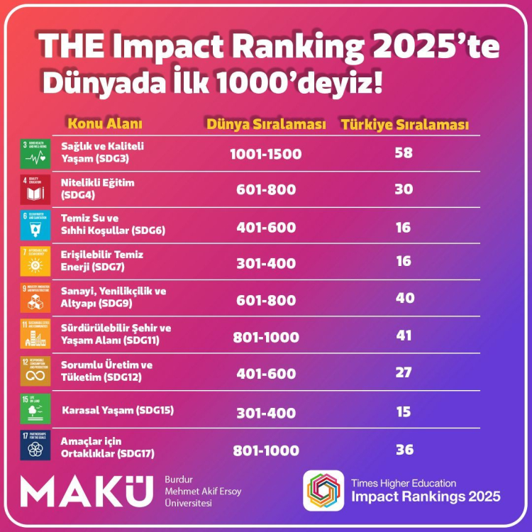 MAKÜ, üniversitelerin toplumsal ve çevresel sorunlara çözüm üretme kapasitelerini Birleşmiş Milletler Sürdürülebilir Kalkınma Amaçları (SDGs) doğrultusunda ölçen sistem olan Times Higher Education (THE) 2025 Etki Sıralaması'nda önemli başarılara imza attı. Bu yıl 130 ülkeden 2,526 üniversitenin başvurduğu sıralamada yer alması, MAKÜ'nün küresel vizyonunu ve toplumsal sorumluluk bilincini bir kez daha ortaya koydu.