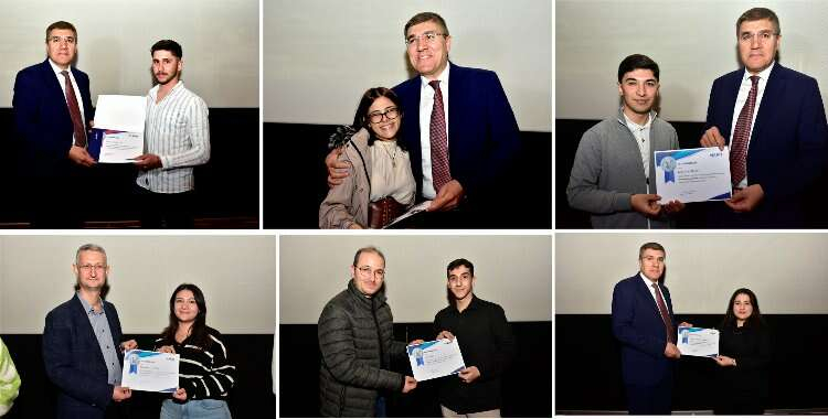 Sonrasında Rektör Prof. Dr. Hüseyin Dalgar, Rektör Yardımcısı Prof. Dr. Ömer Tekşen ve Rektör Danışmanı Prof. Dr. Ali Murat Alpaslan, sergiye katılan tüm öğrencilere katılım belgelerini takdim ettiler.