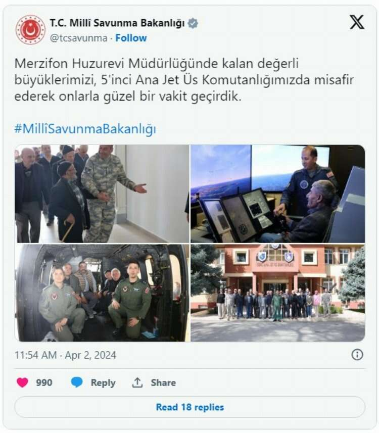 Bakanlıktan yapılan açıklamada, "Merzifon Huzurevi Müdürlüğünde kalan değerli büyüklerimizi, 5'inci Ana Jet Üs Komutanlığımızda misafir ederek onlarla güzel vakit geçirdik." ifadelerine yer verildi.