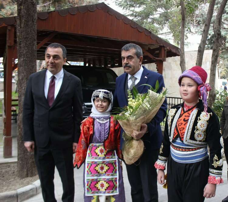 Bir dizi program ve ziyaretlerde bulunmak üzere kentte gelen Tekin'i Valilik önünde yöresel kıyafet giyen çocuklar çiçekle karşıladı.
