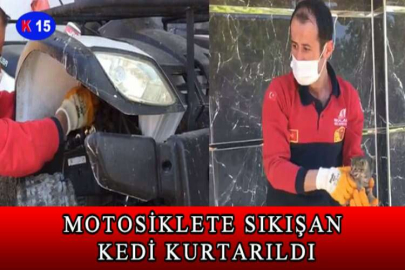 MOTOSİKLETE SIKIŞAN KEDİ KURTARILDI
