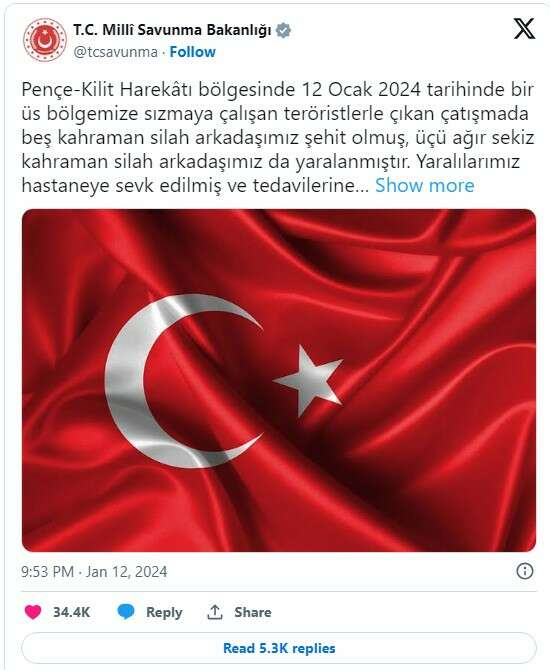 "Pençe-Kilit Harekatı bölgesinde 12 Ocak'ta bir üs bölgemize sızmaya çalışan teröristlerle çıkan çatışmada 5 kahraman silah arkadaşımız şehit olmuş, 3'ü ağır 8 kahraman silah arkadaşımız da yaralanmıştır. Yaralılarımız hastaneye sevk edilmiş ve tedavilerine başlanmıştır.