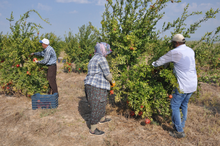 Yaş meyve ve sebze üretimiyle öne çıkan ilçede sezonun ilk nar hasadı, Mustafa Ata'nın Kurtuluş Mahallesi'ndeki 35 dönümlük bahçesinde yapıldı.