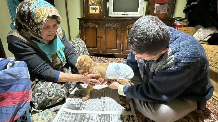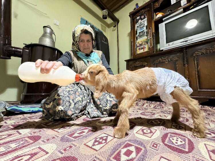- Sütü gelmeyen annesinin bakamadığı yeni doğan oğlağı aldıkları evlerinde, biberonla besleyip altına bebek bezi bağlıyorlar