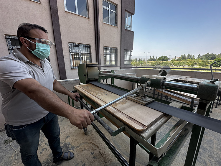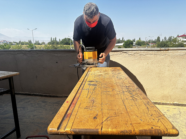 Iğdır'da meslek lisesinde yapılan makineyle okul sıraları yenileniyor.