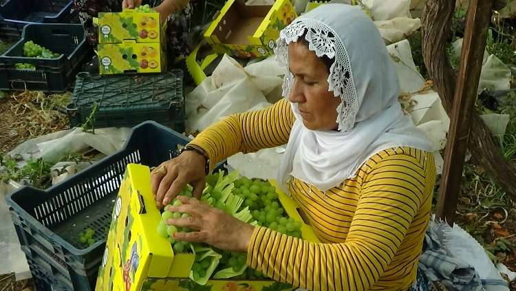 İşçilerin makasla asmalardan kestiği üzümler, sandıklara yerleştirildi.