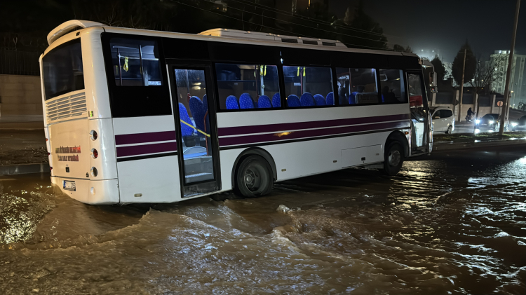 Adana'da özel halk otobüsü, su borusu patlaması sonucu oluşan çukura düştü.