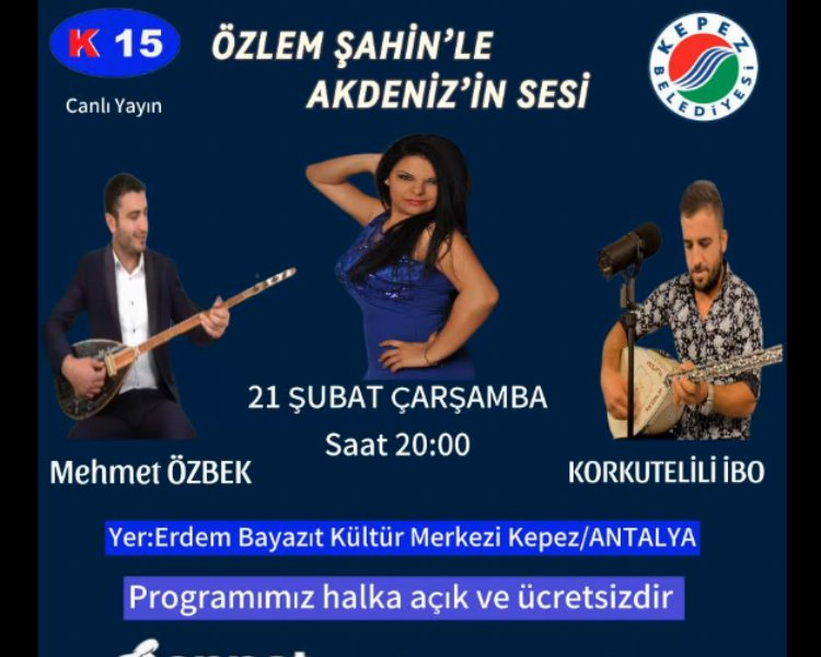 Kanal 15 ekranlarında 15 günde bir Çarşamba akşamları yayınlanan “Özlem Şahin ile Akdeniz’in Sesi” programı yarın akşam canlı yayınla sizlerle olacak. Özlem Şahin’in hazırlayıp sunduğu programın bu haftaki konuğu Korkutelili İbo ve Mehmet Özbek olacak. Özlem Şahin ve konuğu, sevilen türküleri, canlı yayında sizler için seslendirecek. Yarın akşam saat 20.00’de Antalya Erdem Bayazıt Kültür Merkezi’nden yayınlanacak olan “Özlem Şahin ile Akdeniz’in Sesi” programını sakın kaçırmayın.