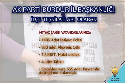 “Bu yıl koronavirüs salgınından dolayı maalesef vatandaşımız tarafından büyük beğeni alan iftar ve gönül sofralarımızda buluşamadık. Ama her ramazan ayında olduğu gibi ihtiyaç sahibi ailelerimizin bir nebze de olsa yanlarında olmaya çalıştık. Ramazan ayı sevgi, hoşgörü ve paylaşım ayıdır düşüncesiyle AK Parti Burdur İl ve İlçe Teşkilatlarımızla toplamda yaklaşık değeri 350.000,00₺ değerinde;