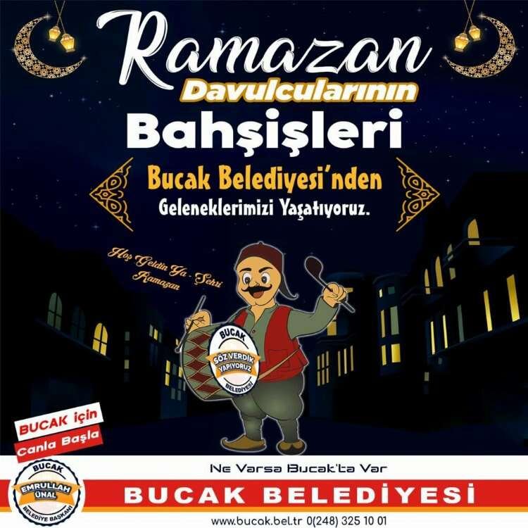 İlçemizde özellikle pandemi döneminde uygulanmayan ve unutulmaya yüz tutan Ramazan ayının en önemli geleneklerinden olan Ramazan Davulcusu uygulamasını bu yıl hayata geçirmeye çalışıyoruz. Ramazan ayında Ramazan davulcusu olarak çalışacak davulcularımızın bahşişini Bucak Belediyesi olarak biz karşılayacağız. ” dedi.