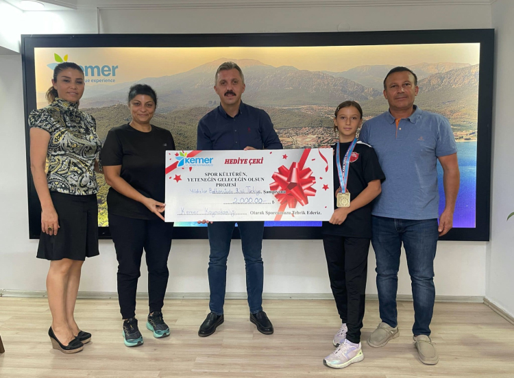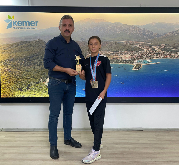Kemer Kaymakamı Ahmet Solmaz, Yıldızlar Balkan Judo Şampiyonası'nda 40 kiloda üçüncü olan Sude Akan'a hediye çeki verdi.