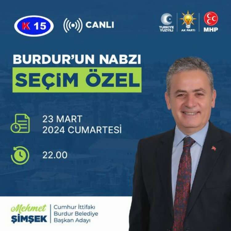Seçim Özel’in bu akşamki konuğu, Cumhur ittifakı Burdur Belediye Başkan Adayı Mehmet Şimşek olacak. Moderatör Bilal Karasakal ve Burdur Gazeteciler Cemiyeti Başkanı Kürşat Tuncel soracak, Cumhur ittifakı Burdur Belediye Başkan Adayı Mehmet Şimşek yanıtlayacak. Bu akşam saat 22.00’de yayınlanacak olan, “Seçim Özel” programını sakın kaçırmayın.