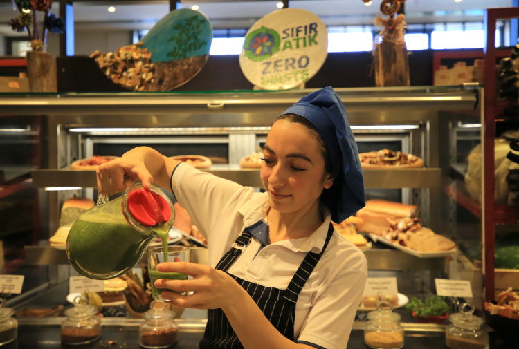 Gökmenoğlu, sebze ve meyvelerden sağladıkları geri dönüşümle misafirlere daha sağlıklı ve daha aromalı ürünler sunarken tüketilebilir durumda olan sebze ve meyvelerin çöpe gitmesini önlediklerini kaydetti.